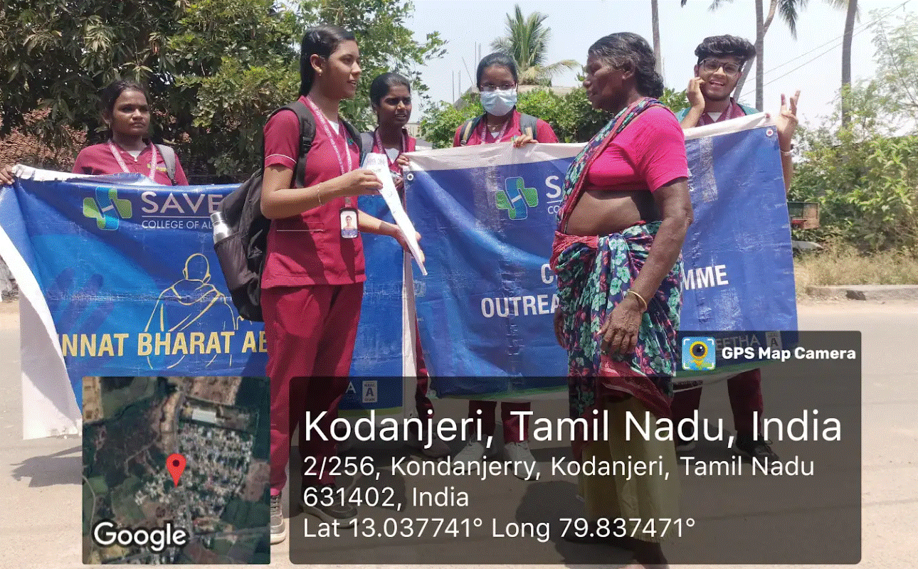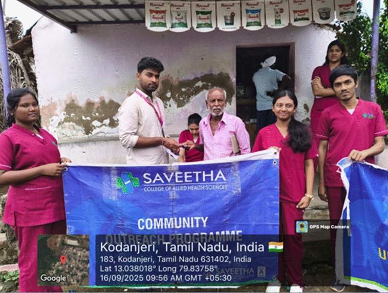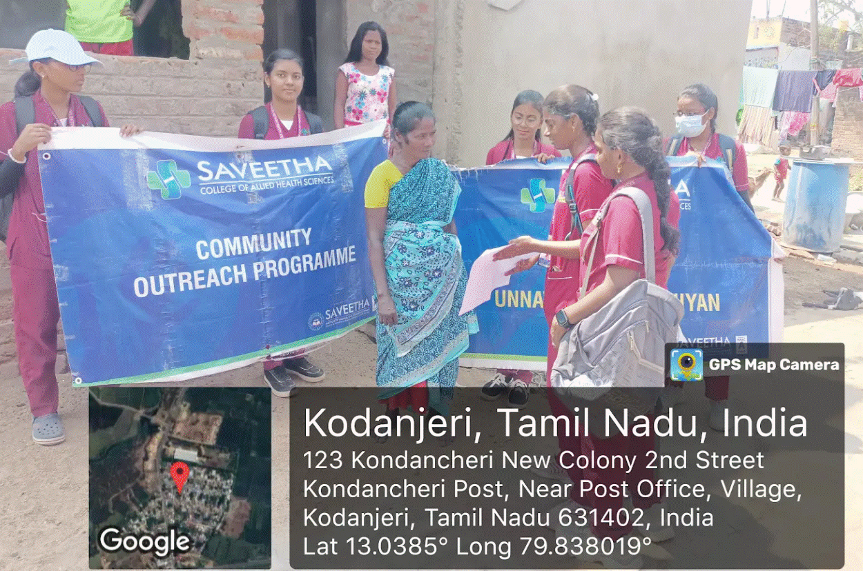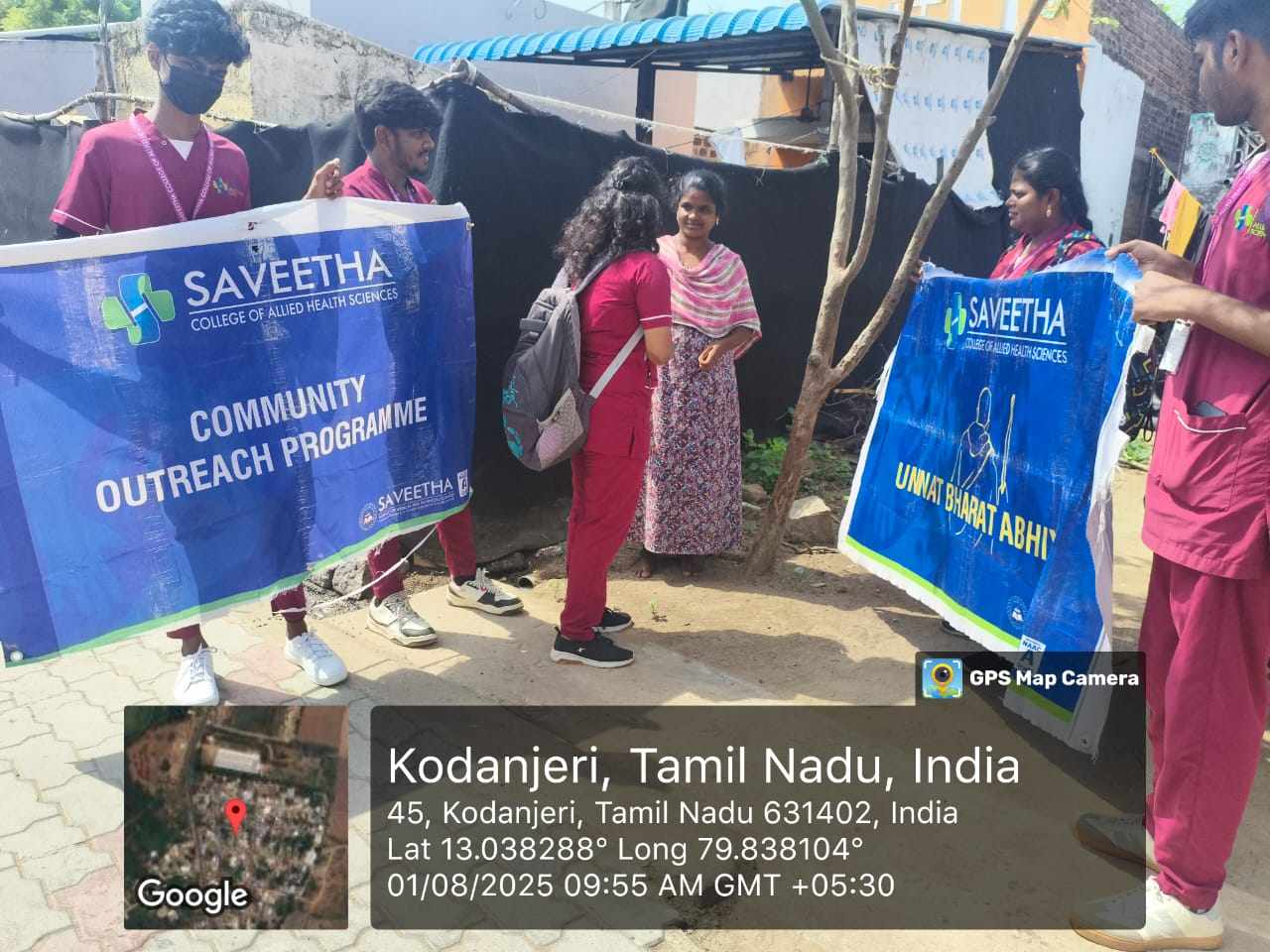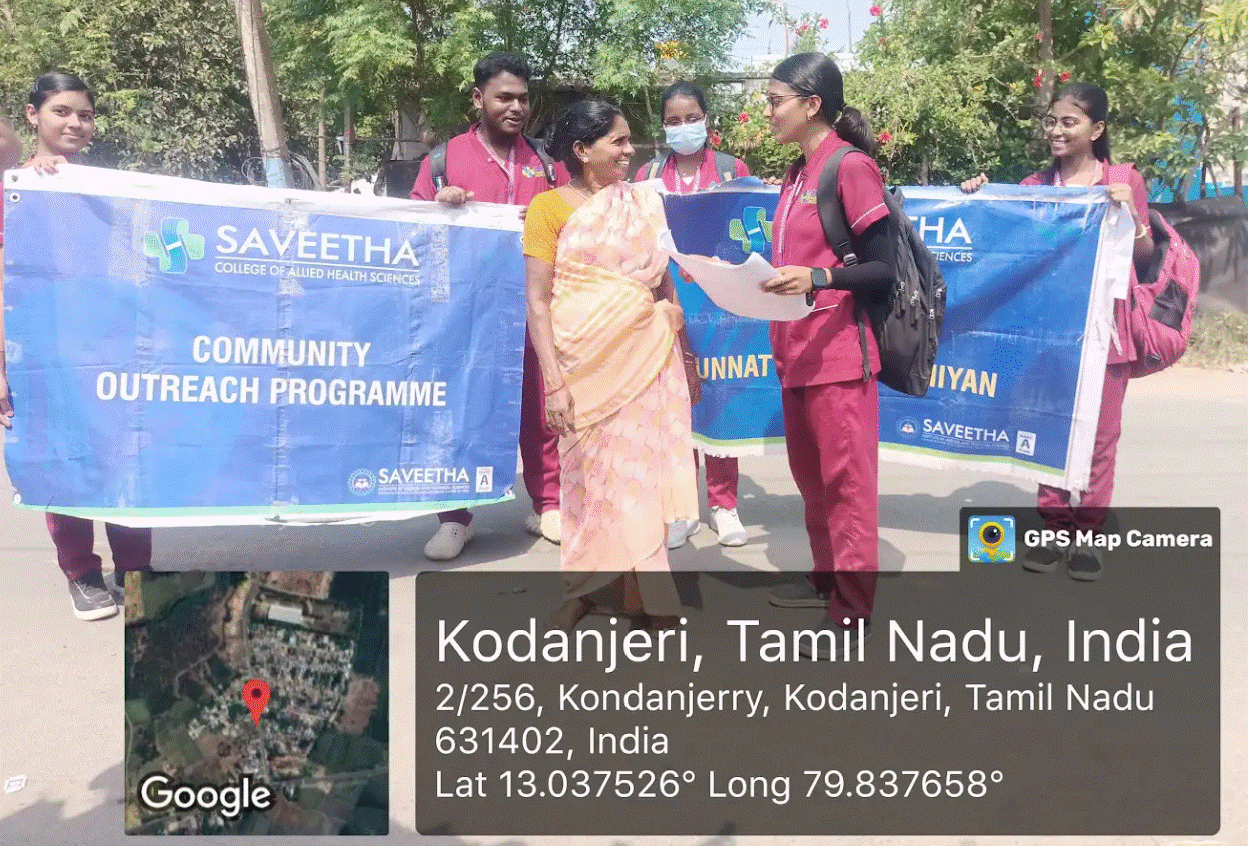 The students of Saveetha College of Allied Health Sciences along with faculty members, conducted Unnat Bharat Abhiyan Survey and community outreach programmes periodically at the Kodancherry village, Thiruvallur district. The community outreach programme was conducted as part of the Unnat Bharath Abhiyan, a flagship program of Ministry of Human Resource Development, Govt. of India. The students enquired the village residents about their family details, education, income, profession in addition to their awareness and access to various government schemes. The team from Saveetha College of Allied Health Sciences also surveyed their general & medical requirements. 480 families of the Kodancherry village benefitted from this Unnat Bharath Abhiyan survey and community outreach program. Free eye camps were also conducted at regular intervals.