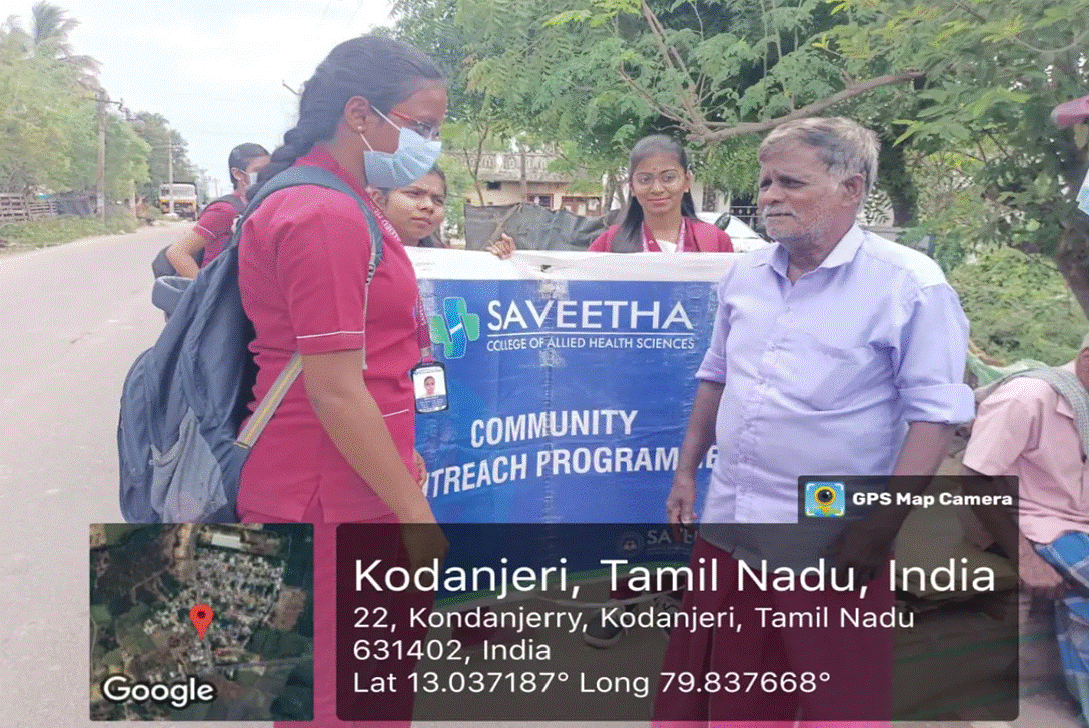 As part of the Unnat Bharat Abhiyan (UBA) and the community outreach program, students from Saveetha College of Allied Health Sciences visited Kondancherry village to raise awareness about asthma, a chronic respiratory condition that affects a significant number of people, particularly in areas with high pollution or allergens. The purpose of the initiative was to educate the villagers on the causes, symptoms, and management of asthma, as well as the importance of early diagnosis and proper treatment. During the session, the students explained that asthma is caused by inflammation and narrowing of the airways, leading to symptoms such as shortness of breath, wheezing, chest tightness, and coughing. They emphasized the role of environmental factors, such as dust, smoke, and pollen, in triggering asthma attacks. The students provided practical advice on managing asthma, including using inhalers as prescribed, avoiding triggers, and maintaining a healthy lifestyle. The interactive session was well-received, and the villagers were encouraged to seek medical help for proper asthma management.