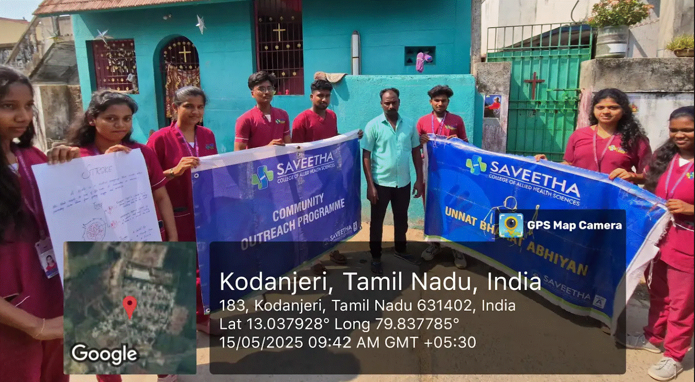 Saveetha College of Allied Health Sciences conducted the camp on 05.11.2025 at kondencherry village. Awareness about Stroke is essential to reduce disability and save lives. A stroke occurs when the blood supply to the brain is blocked or when a blood vessel bursts, leading to brain damage. Recognizing early warning signs is critical. The FAST method helps identify symptoms: F – Face drooping, A – Arm weakness, S – Speech difficulty, T – Time to call emergency care. Other signs include sudden headache, confusion, dizziness, and difficulty walking. Immediate medical attention can improve recovery outcomes. Preventive measures such as controlling blood pressure, managing diabetes, avoiding smoking and alcohol, regular exercise, and a healthy diet reduce stroke risk. Community education creates hope and improves survival.