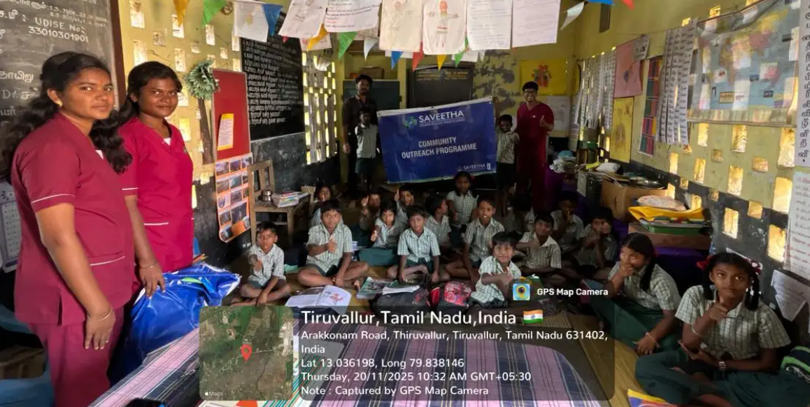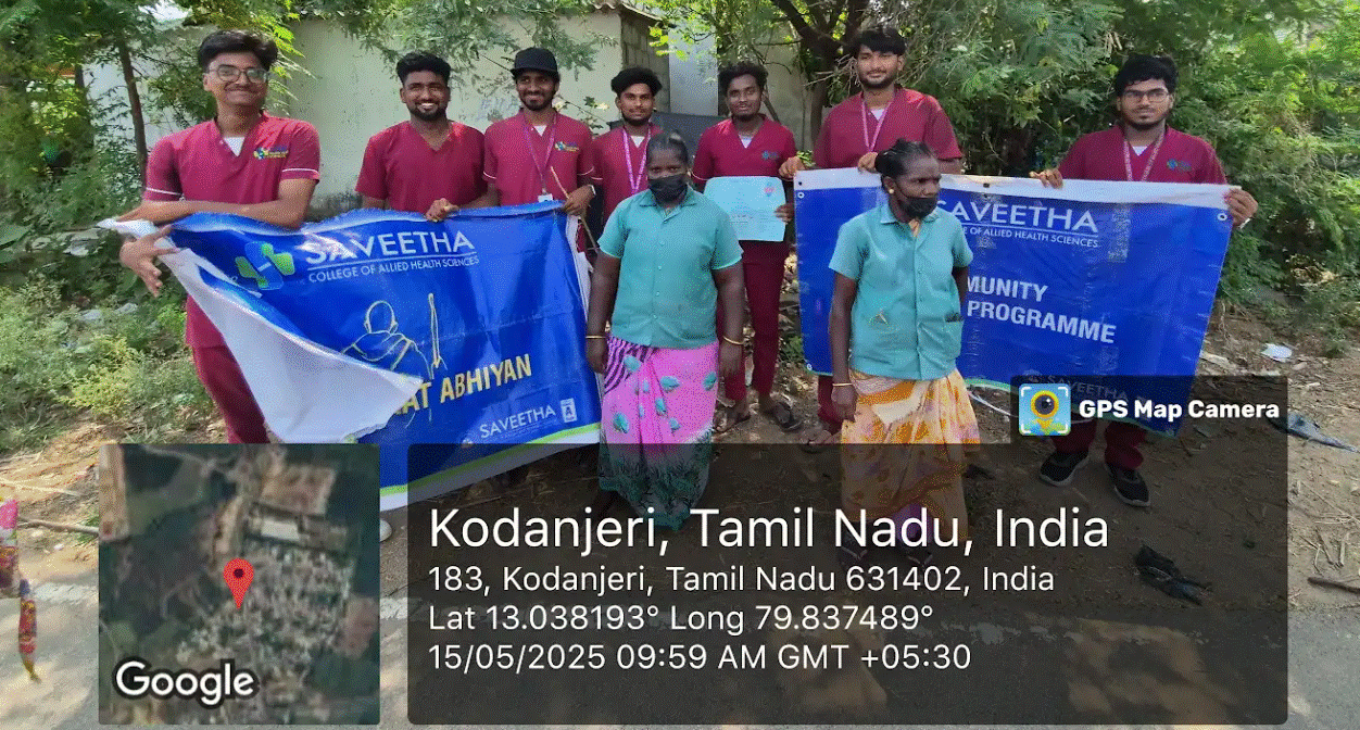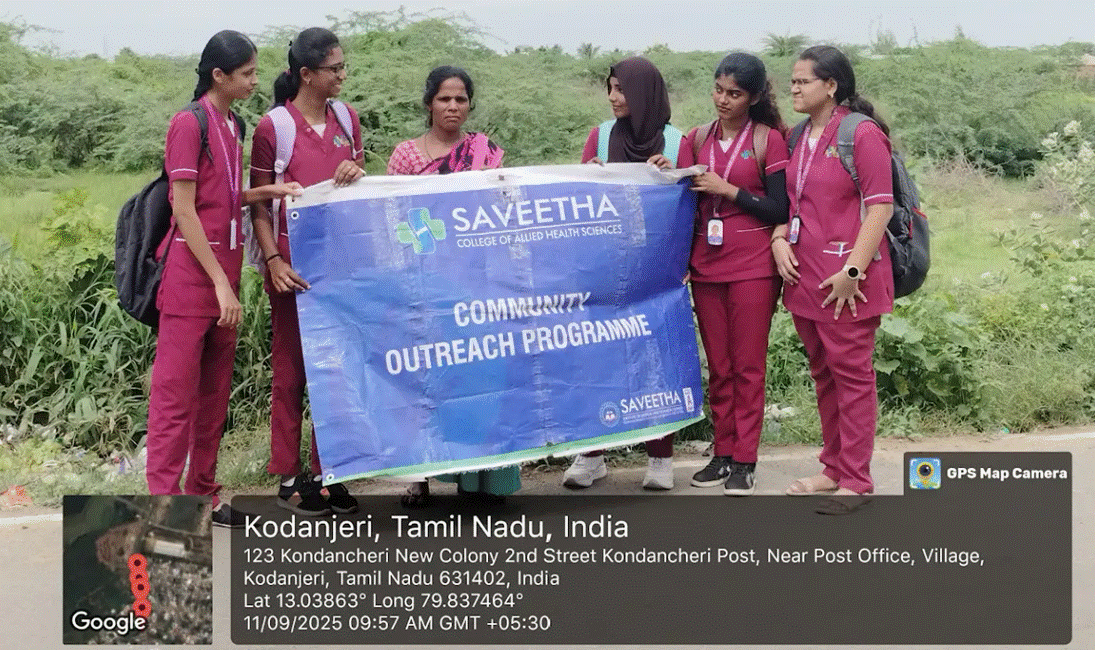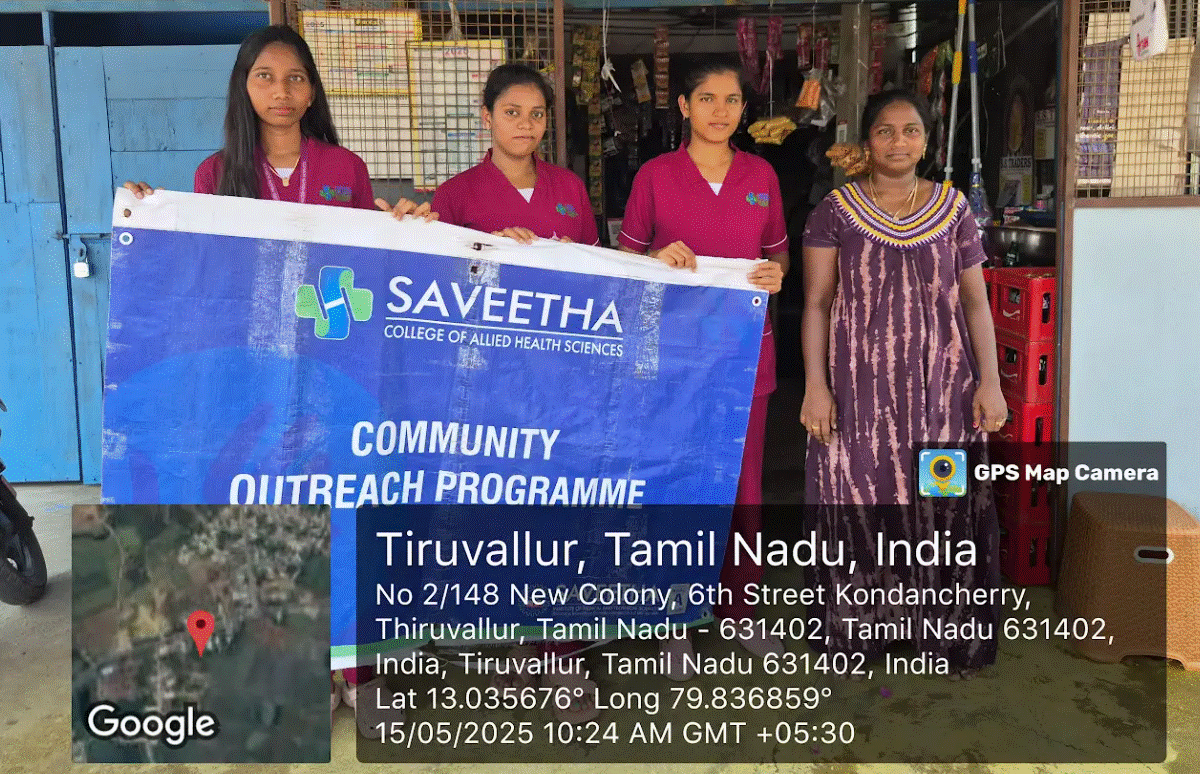 Saveetha College of Allied Health Sciences students conducted the camp in kondancherry village on 05.11.2025. Awareness of the menstrual cycle is essential for promoting women’s health and wellbeing. Understanding the stages of the cycle, hormonal changes, and common symptoms helps individuals manage physical and emotional changes more confidently. Proper knowledge also encourages good hygiene practices, preventing infections and maintaining overall health. Educating young girls about menstruation helps break myths, taboos, and social stigma, enabling them to feel confident and supported. Families, schools, and communities play an important role in creating a positive and respectful environment. Menstrual awareness also promotes access to sanitary products and healthcare support, empowering women to lead healthy, dignified, and active lives.