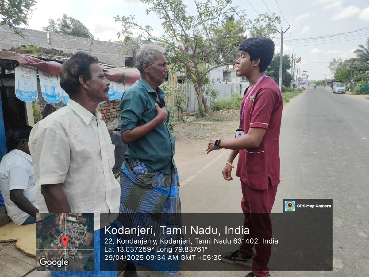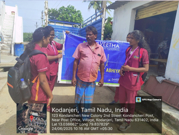 As part of the Unnat Bharat Abhiyan (UBA) and the community outreach initiative, students from Saveetha College of Allied Health Sciences visited Kondancherry village to conduct an awareness program on kidney stones. The objective of the campaign was to educate the villagers about the causes, symptoms, prevention, and management of kidney stone formation, a condition increasingly common due to dietary habits and inadequate hydration. During the session, the students explained how factors such as insufficient water intake, high salt consumption, and excessive intake of oxalate-rich foods can contribute to the development of kidney stones. They also discussed the symptoms, including severe abdominal or back pain, nausea, and difficulty in urination, and emphasized the importance of early diagnosis. Practical tips such as maintaining proper hydration, reducing salt and animal protein in the diet, and seeking timely medical help were shared. The villagers showed active participation, making the session interactive and impactful in spreading essential health knowledge.