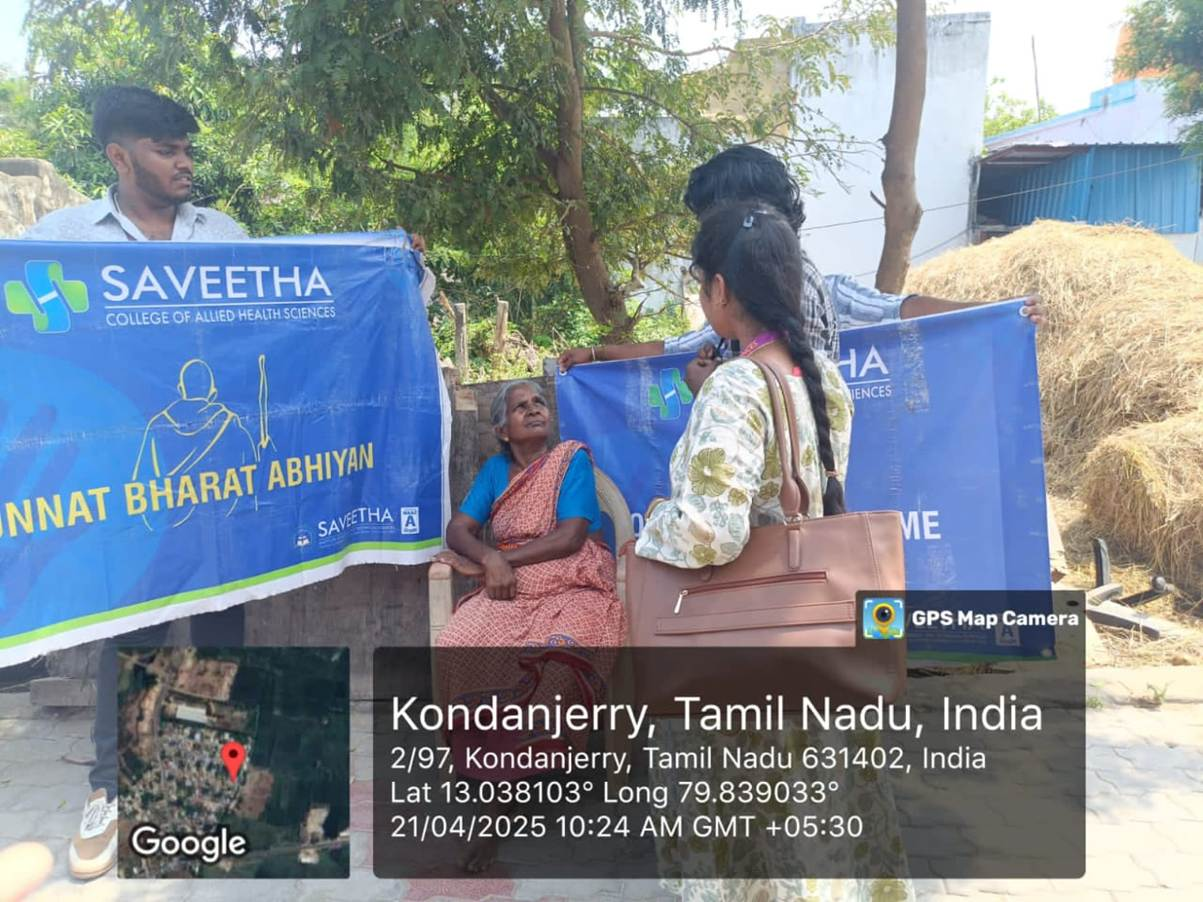 As a part of University's UBA (Unnat Bharat Abhiyan) the students of Saveetha College of Allied Health Sciences, conducted an awareness camp at Kondanjeri Village to educate the community about the harmful effects of smoking and tobacco consumption on individual and public health. The primary objective of the camp was to create awareness about the serious health risks linked to tobacco use, including lung cancer, oral cancer, heart disease, stroke, and respiratory illnesses.