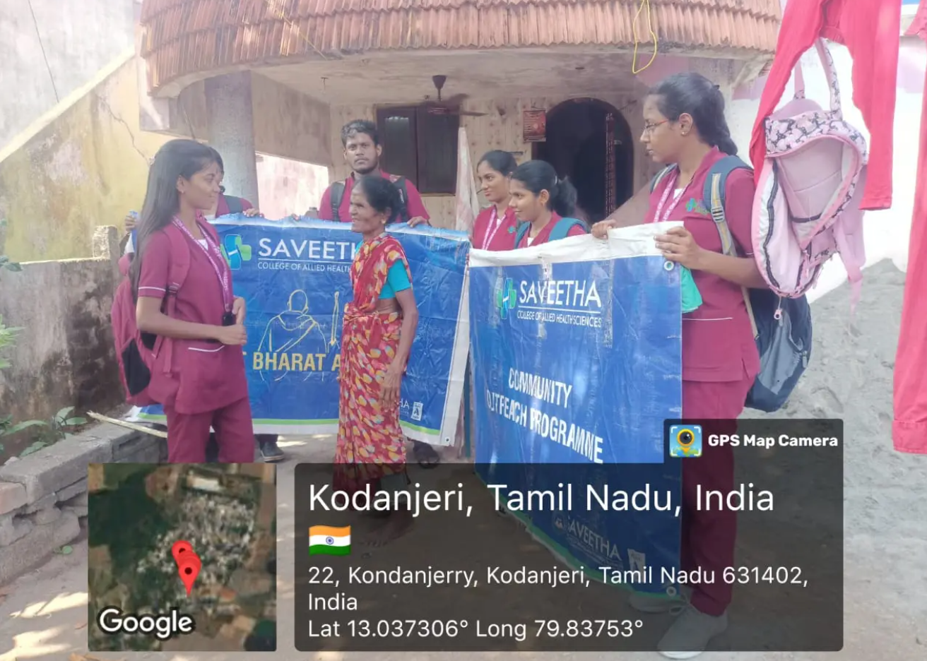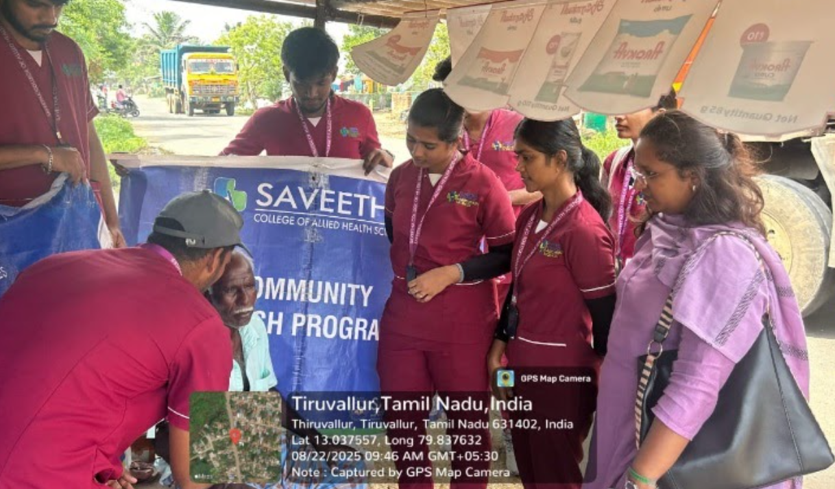 Saveetha College of Allied health sciences conducted the camp on 05.11.2025 at kondencherry village. Awareness about First Aid and Basic Life Support (BLS) is vital for saving lives during medical emergencies. First Aid is the immediate care given to an injured or sick person before professional help arrives. Basic Life Support includes essential steps such as checking responsiveness, calling emergency services, providing CPR, and using an Automated External Defibrillator (AED) when needed. Quick and correct action during cardiac arrest, choking, drowning, bleeding, burns, or fractures can prevent complications and improve survival. Everyone, including students and community members, should learn BLS skills through training programs. Promoting awareness empowers individuals to respond confidently and safely, creating a safer and more prepared society.