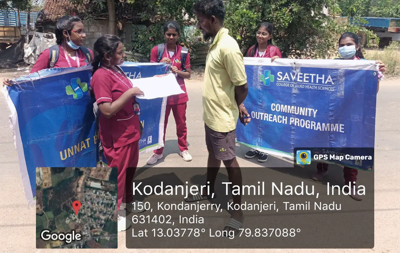 As part of the Unnat Bharat Abhiyan (UBA) and their community outreach initiative, students from Saveetha College of Allied Health Sciences visited Kondancherry village to conduct an awareness program on stomach cancer. The aim of the program was to educate the villagers about the causes, symptoms, prevention, and early detection of stomach cancer.